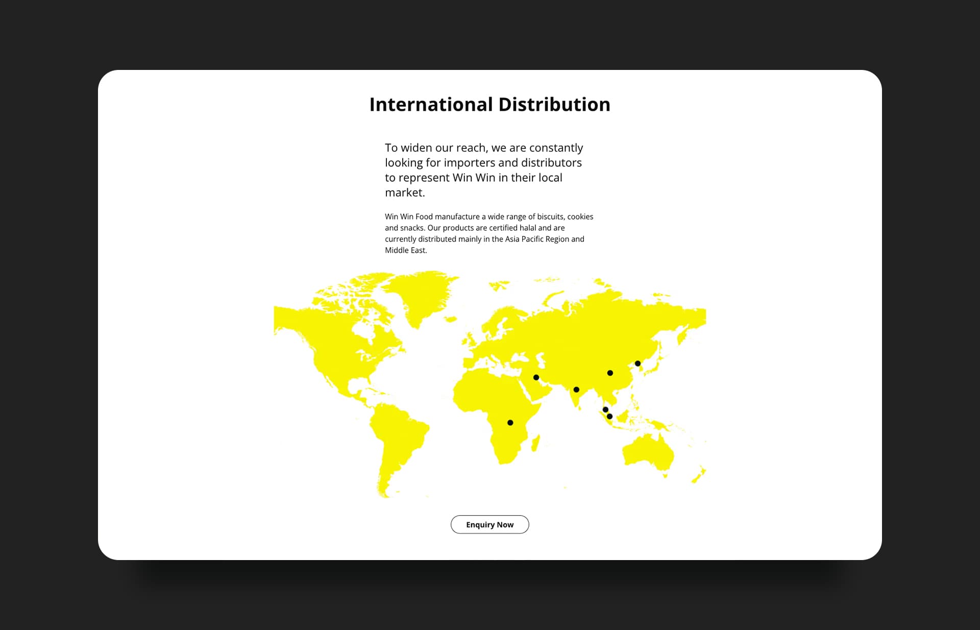 Win Win Food is a leading manufacturer of delectable corn snacks, wafer rolls, chocolate sweets and variety of delicious biscuit and cookie products. In 2005, the company located its main production facilities in Johor, Malaysia. At this state-of-the-art facility, Win Win produces a wide range of food products for distribution in Singapore, Malaysia and throughout the Asia Pacific (including China, Japan and Korea) and the Middle East.