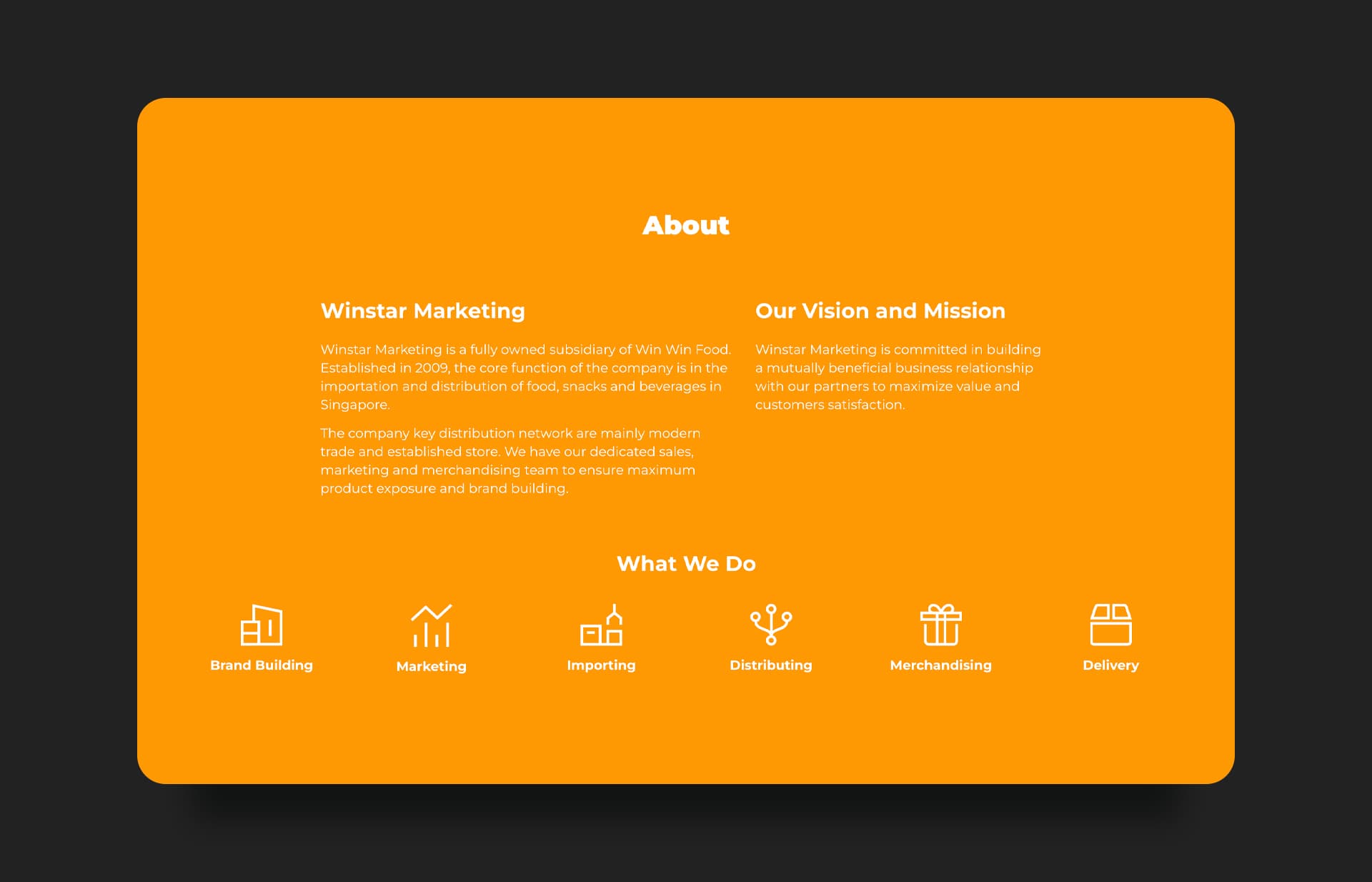Winstar Marketing is a fully owned subsidiary of Win Win Food. Established in 2009, the core function of the company is in the importation and distribution of food, snacks and beverages in Singapore. The company key distribution network are mainly modern trade and established store. We have our dedicated sales, marketing and merchandising team to ensure maximum product exposure and brand building.